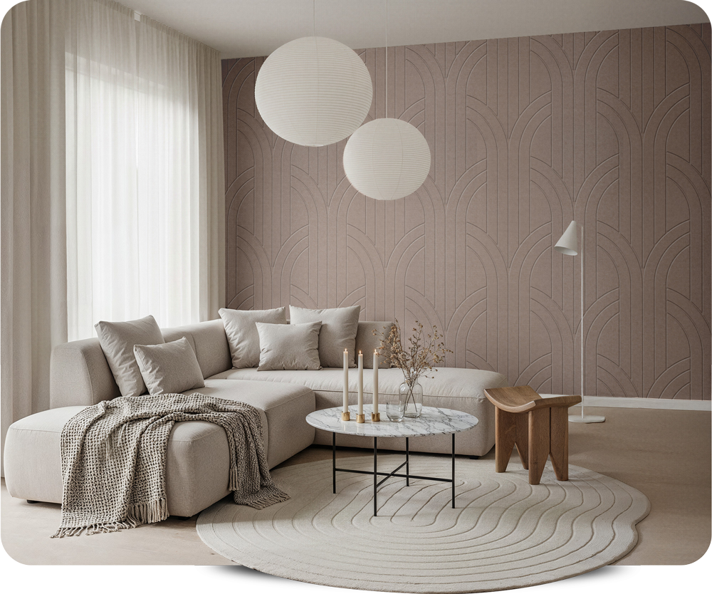 Gemaakt van gerecycled PET-vilt. Goed voor je akoestiek, mooi aan je muur. Bekijk onze plint-tot-plafond panelen en kies je favoriete design.