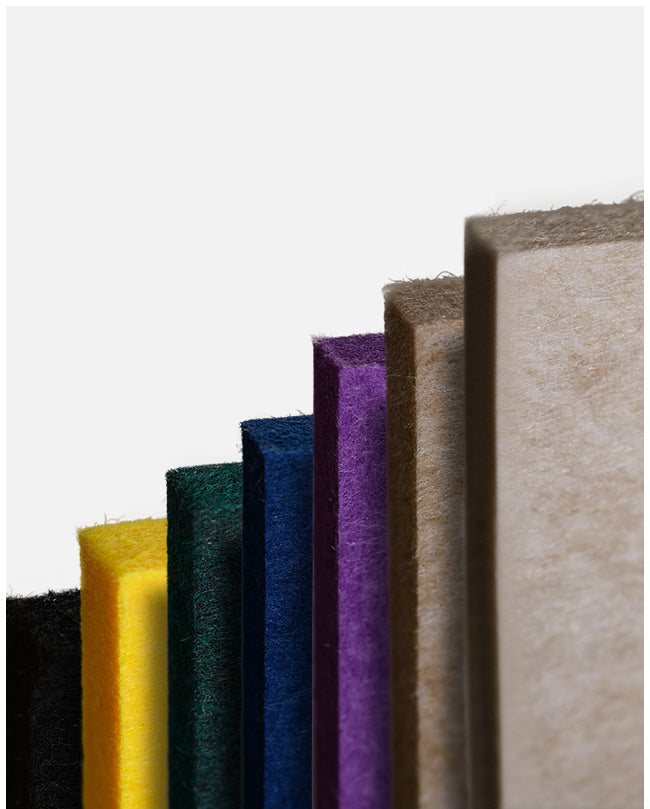 Onze producten beginnen allemaal met een simpele PET-fles. Die fles krijgt bij ons een tweede leven als PET-vilt: een sterk, duurzaam en verrassend warm materiaal met een unieke uitstraling. PET-vilt is niet alleen goed voor het milieu, maar heeft ook uitstekende akoestische eigenschappen. Zo maken we ontwerpen die mooi zijn om te zien én goed doen voor je omgeving.