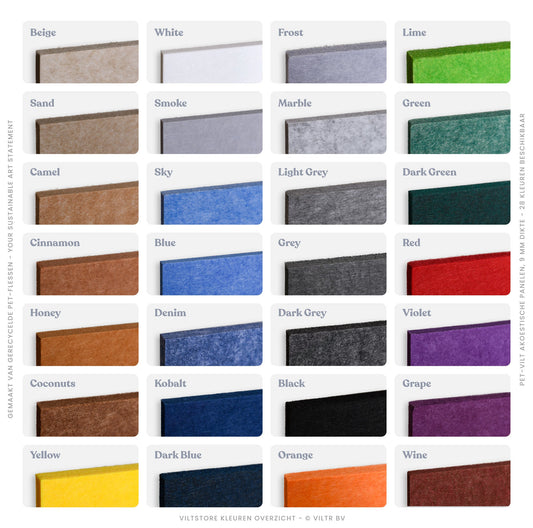 Twijfel je nog over de juiste kleur voor je project? Met onze PET-vilt samples krijg je een realistisch beeld van de kleur, textuur en kwaliteit van het materiaal. Zo kun je eenvoudig combinaties testen en ontdekken wat het beste past bij jouw stijl of interieur.
