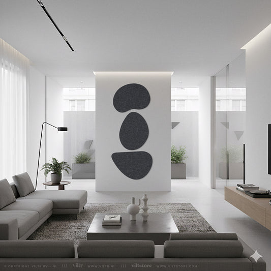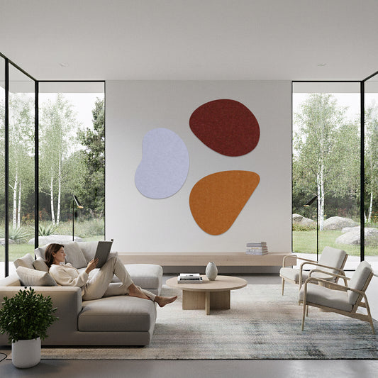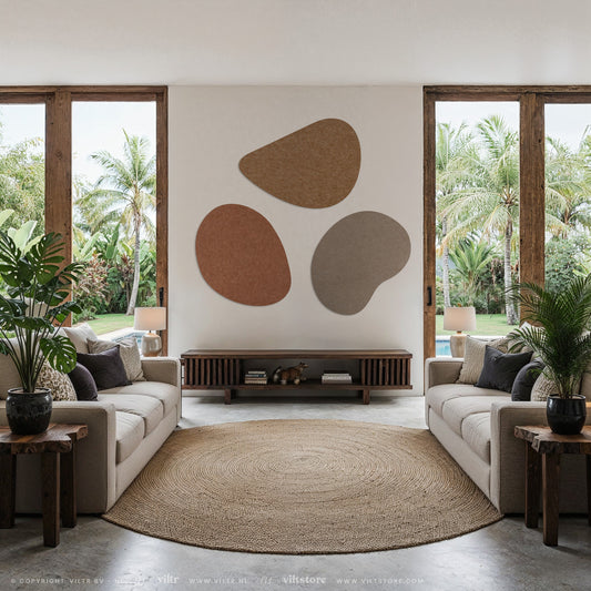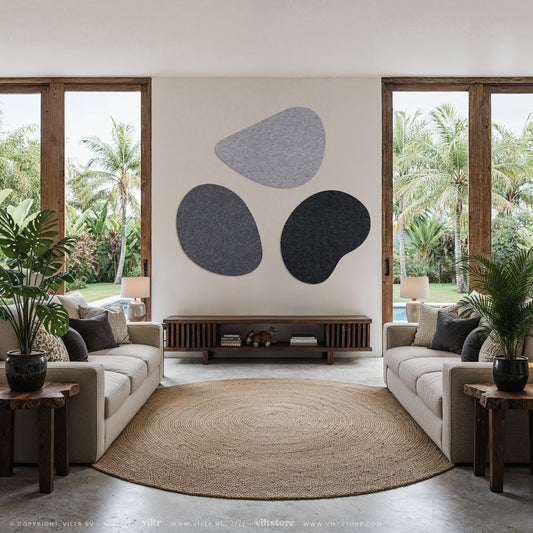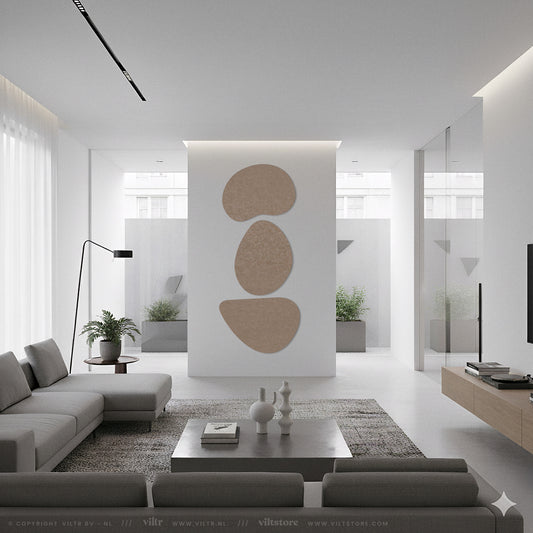 Breng de natuurlijke schoonheid van organische vormen naar je interieur met deze Pebbles van Scherp Interieur. Deze unieke wanddecoratie is gemaakt van PET-vilt panelen en biedt een eigentijdse uitstraling. Kies uit drie kleurencombinaties en drie afmetingen om je eigen stijl te creëren. De panelen zijn voorbereid met dubbelzijdig tape. Je kunt meerdere sets combineren voor een muurvullend design.De Pebbles komen altijd in een set van 3 panelen. De afmeting per pebble kun je zelf kiezen, er zijn 3 opties mogelijk. Het totale artwork is 3x een paneel van de gekozen afmeting. Je bent helemaal vrij om de Pebbles naast elkaar, boven elkaar en/of gedraaid te plaatsen op jouw wand.Kleuren: Combi: Wine + Honey + FrostWarm: Camel + Sand + CinnamonKoud: Light Grey + Marble + Dark Grey